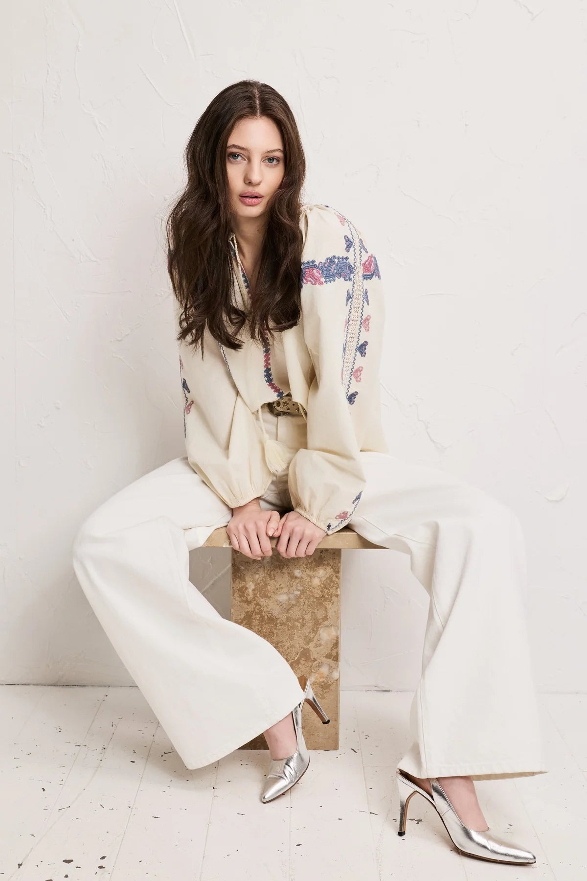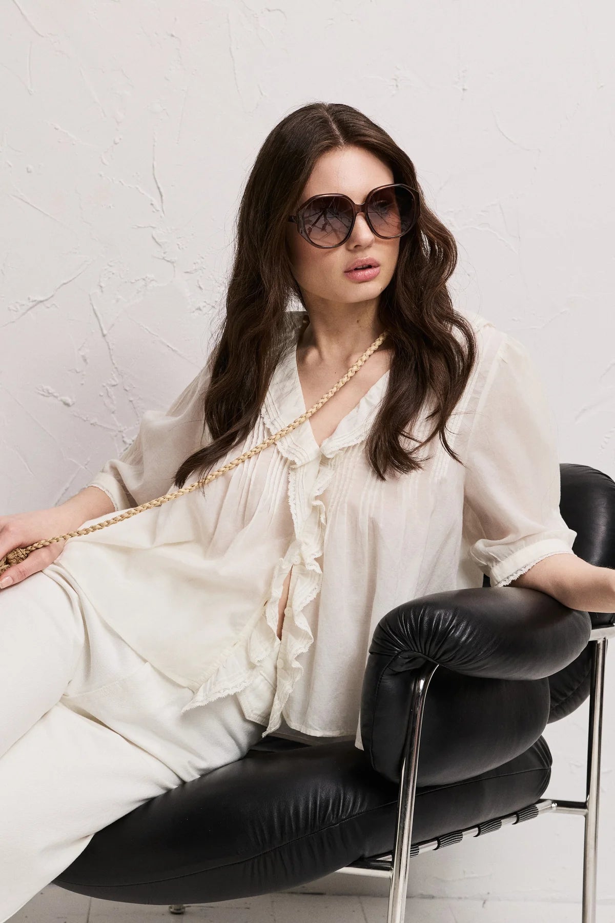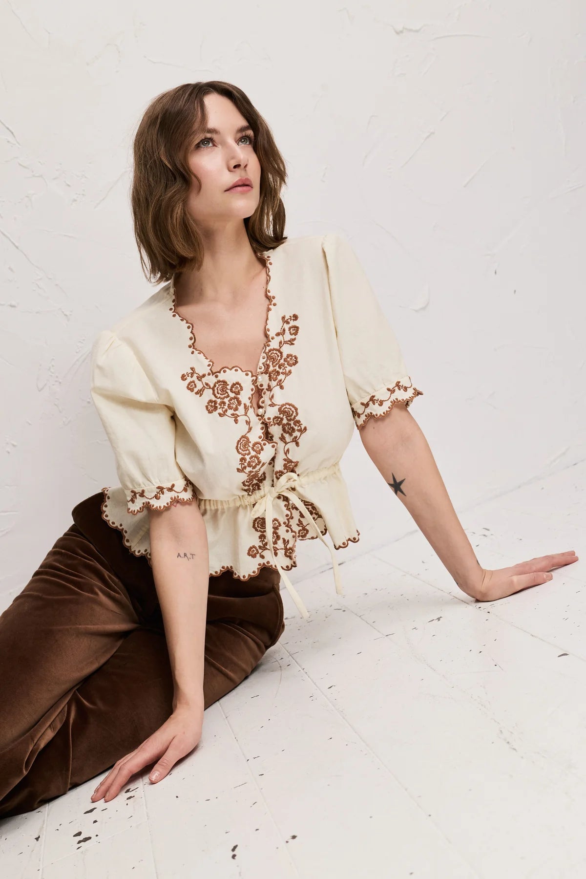 En ermeløs, prikkete bluse med en skreddersydd, nesten dressinspirert følelse. Definert gjennom midjen med en subtil utsving, avsluttet med en hakket krage og en knappelukking foran. Strukturert, men avslappet. Den typen plagg som holder formen og fremhever alt du bruker det med. Designet for å brukes alene, eller som en del av et matchende sett med de matchende buksene. Polert, men ikke dyrebart. Lett å style, vanskelig å ignorere. Sammensetning: 60 % CUPRO 40 % VISKOSE